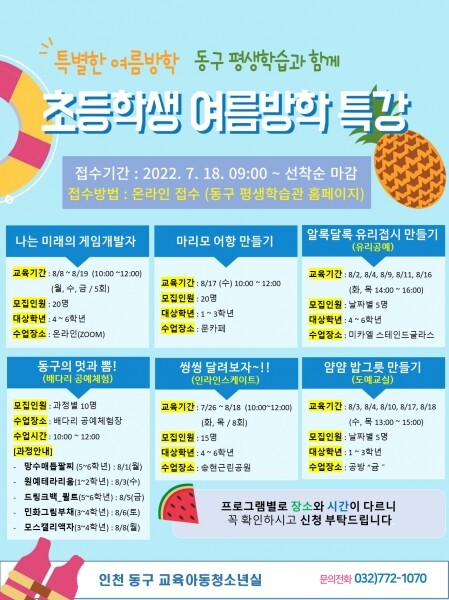 김찬진 구청장은 “여름방학 기간을 활용해 학생들이 다양한 경험을 할 수 있도록 평생학습도시에 걸맞는 다채로운 프로그램을 마련했다”며 “참여한 학생 모두 이번 방학이 가장 보람있고 즐거웠다고 추억할 수 있길 바라며 동구는 앞으로도 학생을 위한 다양한 평생교육 프로그램을 운영해 미래인재 양성을 위해 계속적으로 노력하겠다”고 말했다.