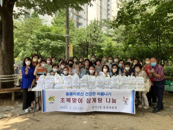 이날 산곡2동 통장자율회는 여름철 무더위로 지친 노인들에게 직접 삼계탕을 전달하며 안부를 확인했다.