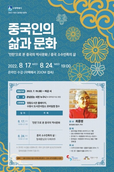 수원시 영통도서관 홈페이지 ‘통합예약/신청→독서문화프로그램’에서 ‘ 2022년 글로벌 인문학 ‘중국인의 삶과 문화’’를 선택해 신청하면 된다.