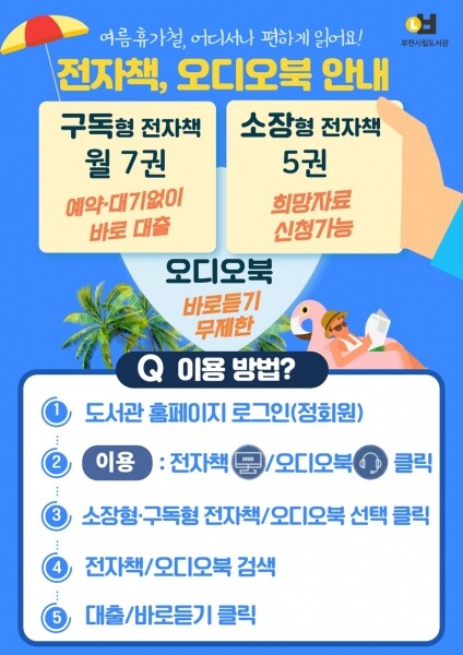 조용익 부천시장은 “여름휴가 동안 휴가지에서 또는 집에서 편하게 북캉스를 즐길 수 있도록 전자책과 오디오북을 확충할 계획”이라며 “바로 대출이 가능한 구독형 전자책과 더불어 소장형 전자책 및 오디오북을 적극 활용하며 즐겁고 유익한 여름 휴가를 보내시길 바란다”고 말했다.
