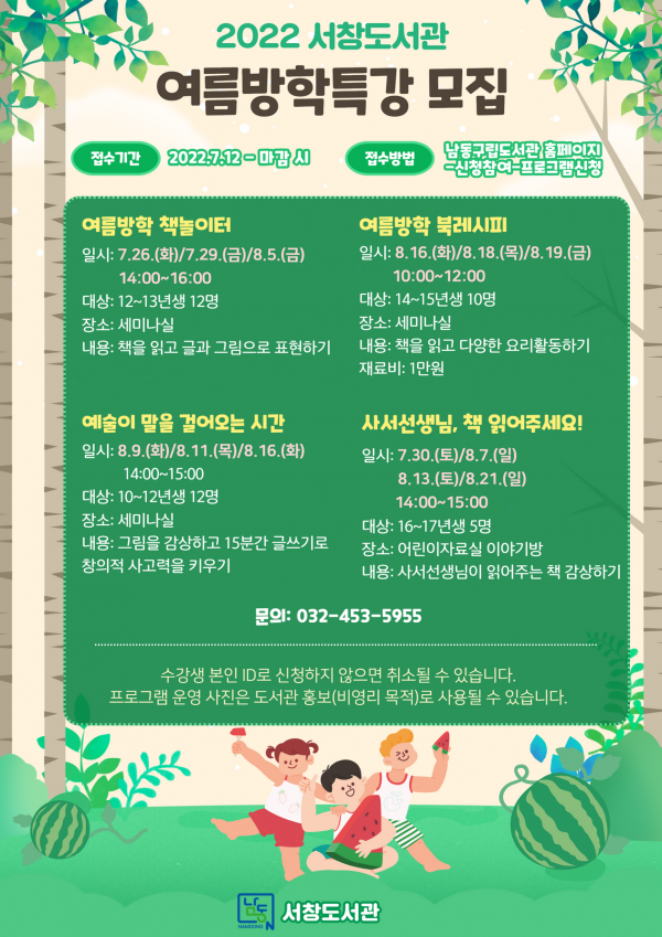 방학 특강으로는 책을 읽고 그림으로 표현하는 ‘여름방학 책 놀이터’ 그림을 감상하고 창의적 사고력을 키울 수 있는 ‘예술이 말을 걸어오는 시간’ 책을 읽고 다양한 요리 활동하는 ‘여름방학 북 레시피’를 초등학생 대상으로 운영한다.