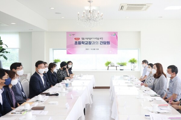 이번 간담회는 코로나19 확산으로 2년여 동안 방역에 힘쓴 학교 및 교육청 관계자에 대한 노고를 치하하고 앞으로 의왕시 교육 발전을 위해 일선 초등학교 교장진과 군포의왕교육청 관계자의 다양한 의견을 청취하기 위해 마련됐다.