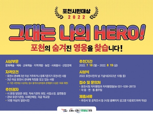 시 관계자는 “포천시의 위상을 높이고 지역발전에 헌신 공헌한 시민들이 많이 추천돼 포천시민의 귀감이 되길 바란다”고 말했다.