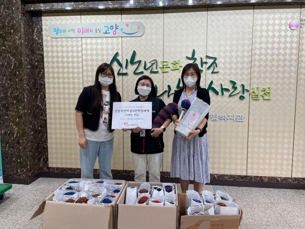 봉사자들이 한땀 한땀 정성껏 제작해 완성된 양말목 안마봉&편백칩 베개 세트는 18일 일산노인종합복지관과 원당종합사회복지관의 취약계층 어르신들께 전달됐다.