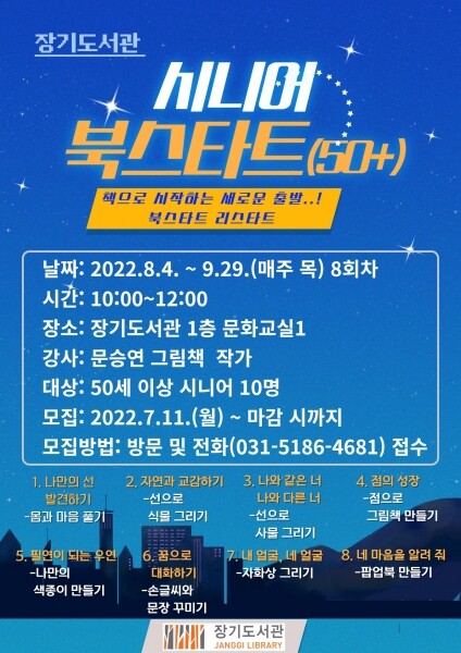 수강 신청은 7월 11일 10:00부터 장기도서관 1층 통합자료실에서 신청 가능하며 선착순 10명까지 접수 가능하다.
