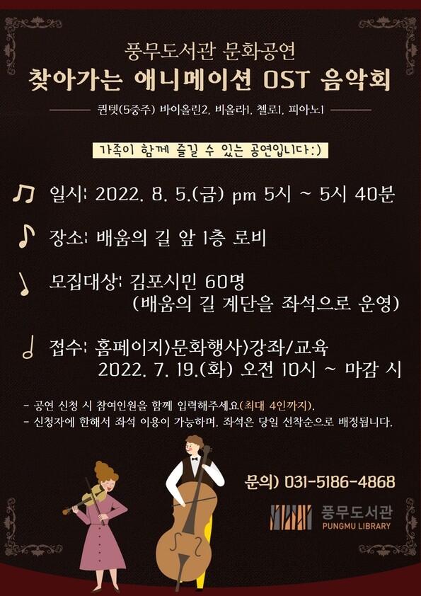 공연 접수는 7월 19일 화요일 오전 10시부터 풍무도서관 홈페이지에서 가능하며 김포시민 60명을 모집해 당일 선착순으로 좌석을 배정한다.