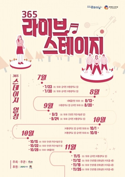 지난 4월 시작한 ‘365 라이브 스테이지’는 오는 23일부터 안성천, 금석천, 내혜홀광장, 안성맞춤 문화살롱에서 토요일 저녁 6시부터 7시까지 열리며 각 공연마다 두 팀의 아티스트가 출연해 여름밤의 낭만을 선사할 예정이다.