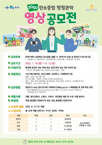 박준희 구청장은 “구에서는 ‘2050 탄소중립 청정관악 영상공모전’은 탄소중립과 기후위기 문제인식을 확산시키고 이를 극복하기 위한 구민 참여를 도모하는 좋은 기회”며 “사람과 자연이 공존하는 지속가능한 도시 청정관악을 위해 앞으로 더욱 노력해 나갈 것”이라고 말했다.