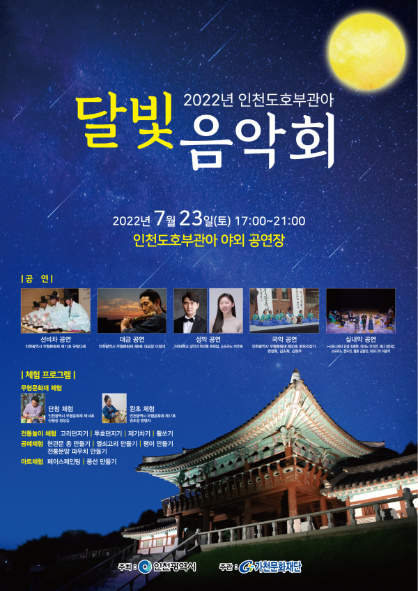 이번 달빛음악회는 조선시대 행정을 담당했던 관청인 인천도호부관아를 배경으로 전통·현대 음악 공연과 다양한 전통·공예 등 체험행사로 진행된다.