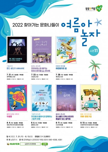 시민들의 문화 일상을 위한 ‘찾아가는 문화나들이’의 일환으로 개최되는‘여름아 놀자’는 집과 가까운 곳에서 가족 단위 관객들이 다채로운 공연을 관람할 수 있도록 기획된 문화 예술 프로그램이다.