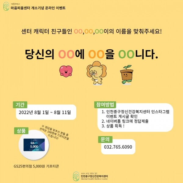 인천중구정신건강복지센터 공식 인스타그램을 통해 참여 신청을 할 수 있으며 마음피움센터 캐릭터 이름을 확인하는 내용으로 진행된다.