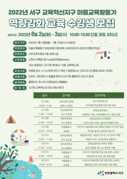 교육생 모집 기간은 오는 27일까지로 자세한 사항은 서구청 홈페이지를 참고해 이메일 신청 또는 서구 교육혁신과로 방문 신청하면 된다.