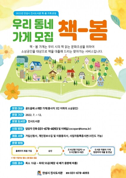 ‘우리동네 책봄 가게’는 안성시 공도읍 소재 소상공인을 대상으로 하며 도서관을 방문할 시간적 여유가 없는 소상공인과 가게를 이용하는 시민들에게 더욱 많은 독서 기회를 제공하고 지역 내에 책 읽는 문화를 정착시키고자 기획됐다.