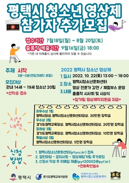 평택시청소년영상제는 평택시 주최, 평택시청소년문화센터·영상단RG 주관, 경기도평택교육지원청 협력으로 진행되며 10월 22일 개최 예정이다.