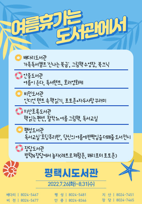 책과 함께하는 의미 있는 행사들이 가득한 도서관에서 무더운 여름을 시원하게 보내보는 건 어떨까? ‘여름휴가는 도서관에서’ 도서관별 상세 프로그램은 평택시도서관 누리집 및 각 도서관으로 문의하면 된다.