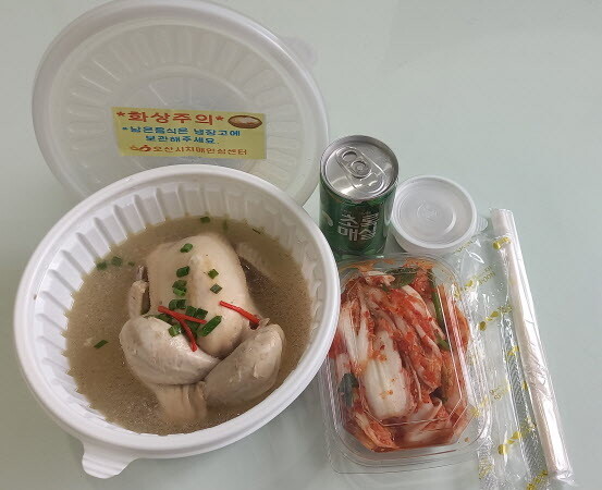 무더위 이기는 삼계탕은 복날을 맞아 노인 일자리 전담 기관 오산시니어클럽 내 손맛찬과 연계해 당일 제작한 영양가득 삼계탕, 배추겉절이 등을 치매안심센터 직원들이 대상자의 가정으로 개별 방문해 전달하고 있다.