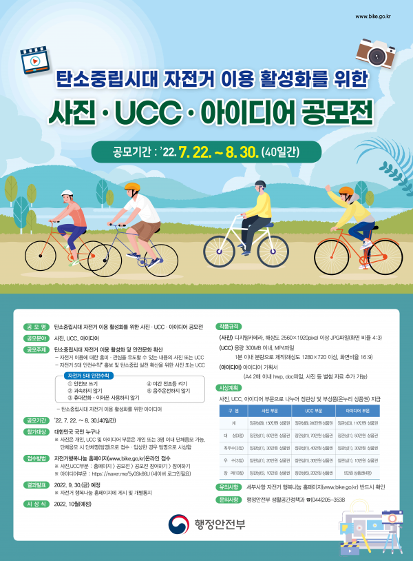 김광용 행정안전부 지역발전정책관은 “자전거는 생활속에서 탄소중립을 실천하는 가장 효과적인 교통수단”이라며 “이번 공모전에 편리하고 안전하게 자전거를 타는 사진, 영상 및 아이디어 등이 많이 응모될 수 있도록 관심과 참여를 기대한다”고 말했다.