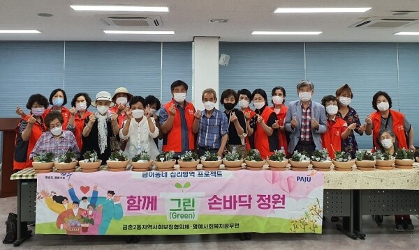 ‘함께 그린 손바닥 정원’ 사업은 금촌2동 지역사회보장협의체 신규 특화사업으로 코로나19 장기화로 고독사 위험과 우울감이 높은 중증질환자, 장애인, 노인 등 취약계층 1인 가구를 위한 금촌2동만의 심리방역프로젝트로 11월까지 진행된다.
