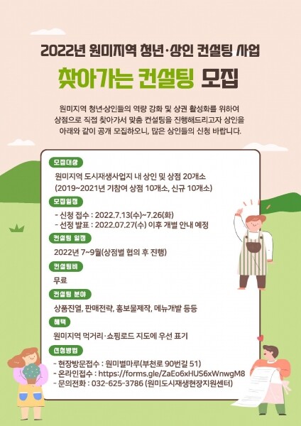‘2022년 원미지역 청년·상인 맞춤형 컨설팅’은 도시재생사업지에 위치한 상가별 요구에 따라 개별 맞춤 컨설팅을 시행하며 ‘찾아오는 컨설팅’과 ‘찾아가는 컨설팅’으로 진행된다.