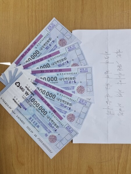 익명의 방문자가 건낸 봉투에는 “작은 물질이지만 지역 어려운 이웃과 함께 하고 싶습니다”고 쓰여 진 편지와 일백만원권 수표 5장이 들어있었다.