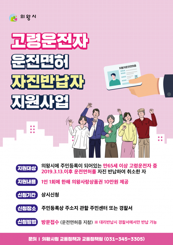 고령운전자 운전면허 자진반납 지원사업은 의왕시에 주소를 두고 운전면허를 가진 만65세 이상은 누구나 신청할 수 있으며 주민등록상 주소지 주민센터 또는 경찰서를 방문해 면허를 반납한 사람에게는 1회에 한해 의왕사랑상품권 10만원을 지급한다.
