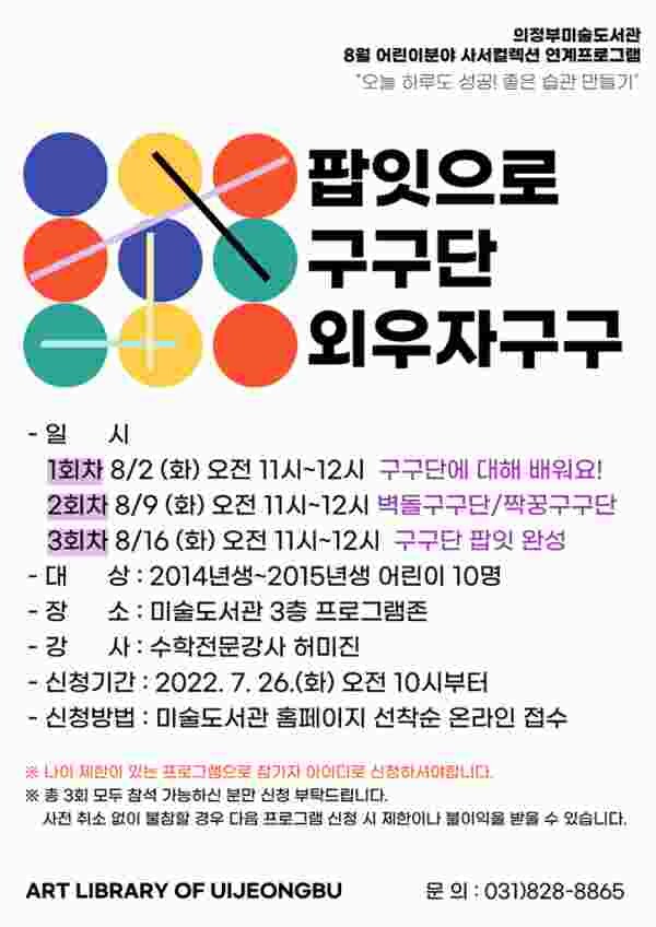 어린이 분야는 8월 2일 오전 11시부터 2014~2015년생 어린이를 대상으로 ‘팝잇으로 구구단 외우자구구’을 주제로 여름방학 3주 동안 팝잇으로 구구단 외우기 프로그램을 진행할 예정이다.