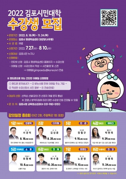 김포시민대학은 8월부터 11월까지 모두 8회에 걸쳐 김포시 평생학습센터 대강당에서 오후 2시에 진행되며 특히 강연 8회 가운데 2회는 직장인들을 위해 저녁 7시에 시작하기로 했다.