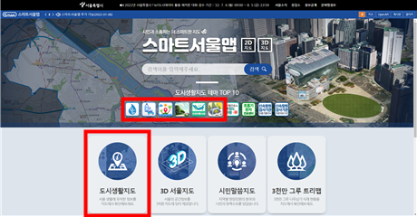 ‘스마트서울맵’ 홈페이지 메인화면에서 여름테마 6종을 확인할 수 있으며 ‘도시생활지도’ 메뉴에서도 확인할 수 있다.