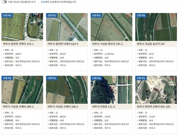 도는 각 시·군으로부터 행정 목적으로 사용하고 있지 않은 일반재산 중 대부 가능한 재산을 조사하고 총 446필지 55만8,491㎡ 규모의 도유재산을 공개했다.