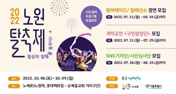 구는 코로나19로 축제가 중단된 이후 3년만에 다시 개최하는 만큼, 더욱 수준높은 퍼레이드 콘텐츠로 ‘2022 노원탈축제’를 함께 이끌어갈 분들을 모집한다고 밝혔다.