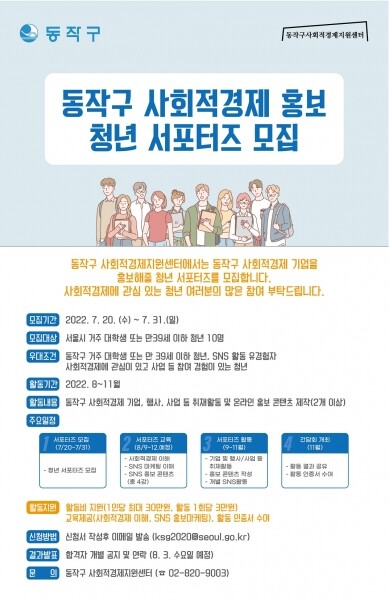 서포터즈가 되고 싶은 청년은 7월 31일까지 동작구사회적경제지원센터 블로그에서 필요한 서류를 다운로드해 작성한 후 이메일로 접수하면 된다.