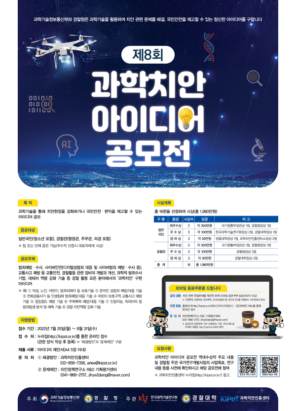 제안된 아이디어는 과학치안 정책 수립 및 신규 연구개발 과제 기획을 위해 활용될 예정으로 공모전 접수 및 세부사항 확인은 과학치안진흥센터 누리집에서 가능하다.