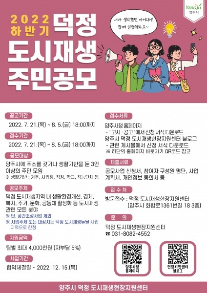 양주시에 주소를 두거나 생활기반을 둔 3인 이상의 주민 모임이라면 누구나 신청할 수 있으며 사업 주제·대상지는 덕정 도시재생뉴딜 사업지역에 한정된다.