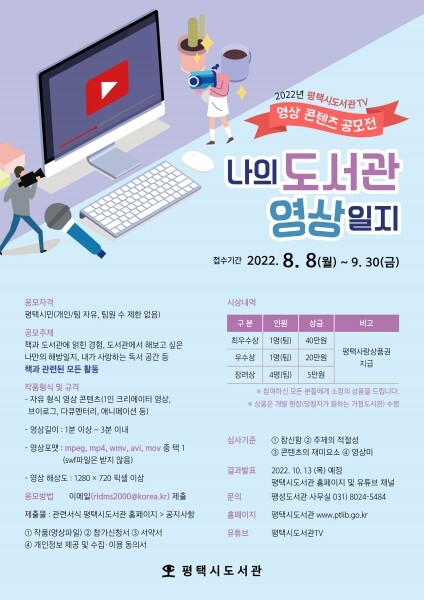 접수기간은 8월 8일부터 9월 30일까지 진행되며 접수된 작품은 심사를 거쳐 10월 13일 평택시도서관 누리집 및 평택시도서관TV 유튜브 채널을 통해 최종 결과를 발표한다.