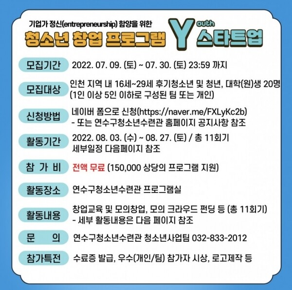 한편 연수구는 지난 2020년부터 청소년시설 설치 및 운영에 관한 조례 제6조에 의거 연수구 청소년수련관을 민간위탁 운영중이며 올해에는 7억 4천여만원의 예산을 투입해 청소년 활동 및 문화 육성을 위해 노력중이다.