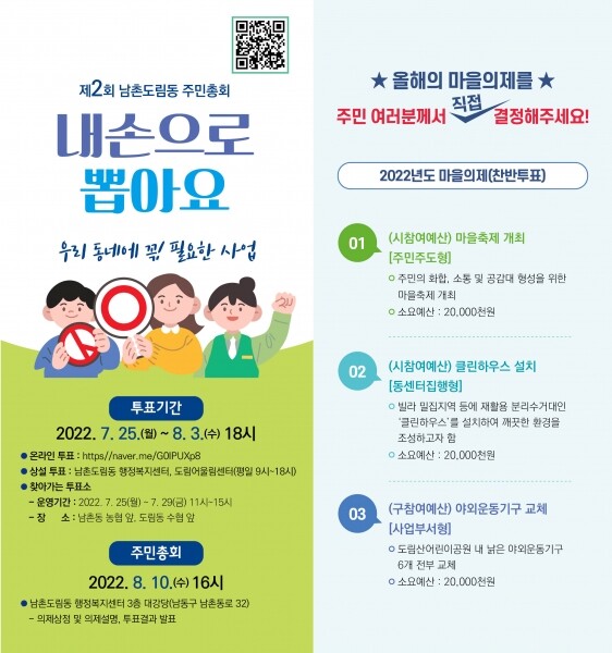 온라인은 QR코드를 통해 접속할 수 있고 오프라인은 평일 오전 9시부터 오후 6시까지 남촌도림동 행정복지센터와 도림어울림센터에 방문 투표하면 된다.