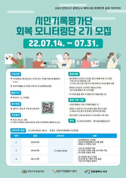참여자들은 다음달 4일을 시작으로 문화도시 사업의 이해 서구 문화도시 사업의 특성모니터링 역량강화 교육 등 사전교육을 받은 후 예비문화도시 사업 현장에 방문해 실제 모니터링 활동을 수행하게 된다.