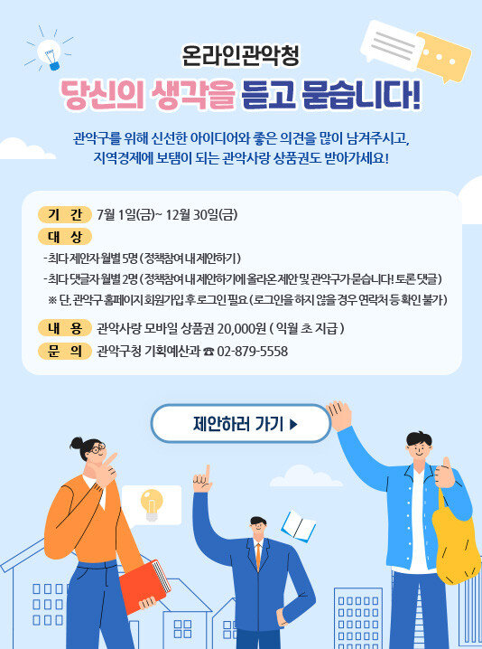 검토된 제안은 심사를 거쳐 우수제안으로 선정해 최대 100만원 상금을 지급하고 12월까지 매월 가장 많은 정책 제안을 하거나 댓글을 다는 주민을 대상으로 ‘관악사랑 상품권’을 지급하는 이벤트도 실시한다.