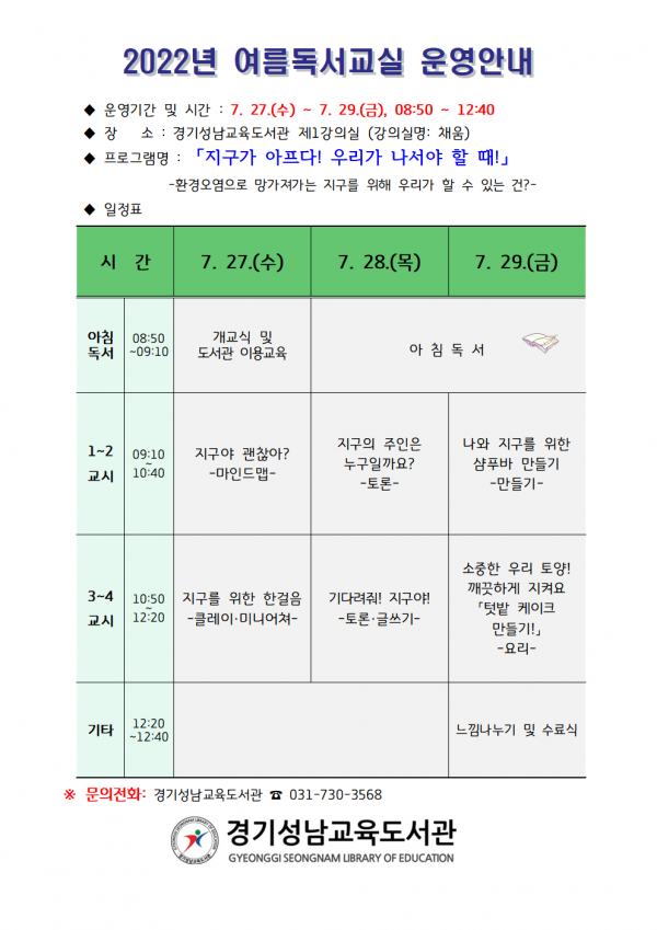 이번 프로그램은 여름방학을 맞이한 학생을 대상으로 독서와 연계한 체험활동 등을 통해 지구환경을 생각하고 도서관 이용을 활성화하고자 여름 독서교실, 여름아, 읽자로 나눠 운영한다.