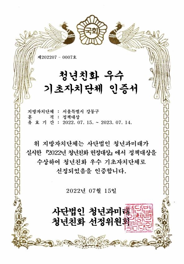 이수희 강동구청장은 “4년 연속 청년친화헌정대상을 수상한 것은 강동구가 청년 정책에 관심을 갖고 다양한 지원사업을 추진해 온 결과”며 “청년문제와 정책수요가 증가함에 따라 더욱 막중한 책임감을 갖고 강동구에서 청년들이 꿈과 희망을 펼쳐 나갈 수 있도록 청년을 위한 인프라를 확충하는 등 지원을 적극 이어나가겠다”고 말했다.