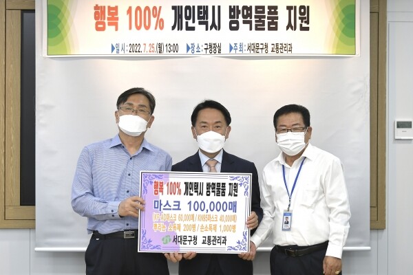 품목은 보건용 마스크 10만 매, 손소독제 천 개, 뿌리는 소독제 200개며 개인택시운송사업조합 서대문지부를 통해 관내 등록된 개인택시 1,200여 대에 비치된다.