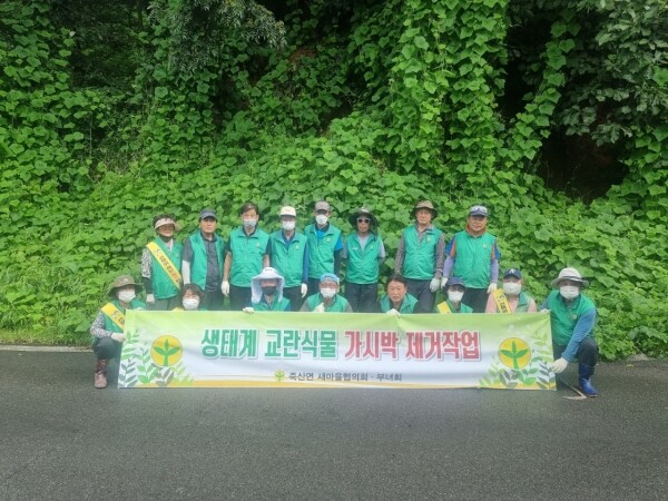 이날 작업에는 새마을협의회원 및 새마을부녀회원 20여명이 참여해 죽산농협 수매장 일대, 죽산면 두교리 일대 도로변 및 들판에 무분별하게 자라있는 가시박 넝쿨을 제거하는 작업을 진행했다.