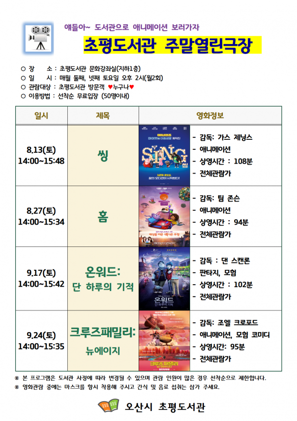 ‘주말 열린극장’은 시민들과 가장 가까운 문화공간인 도서관에서 쉽고 편안하게 문화생활을 누릴 수 있도록 기획한 영화 상영 프로그램으로 월 2회 둘째 넷째 토요일 오후 2시, 초평도서관 문화 강좌실에서 진행되며 사전 신청 없이 당일 선착순 입장으로 무료 이용할 수 있다.