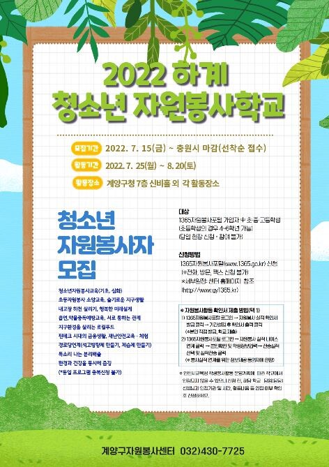 [뉴스써치] 인천광역시 계양구자원봉사센터는 여름방학을 맞아 오는 8월 20일까지 진행되는 하계청소년자원봉사학교에 참여할 청소년 자원봉사자를 모집한다.