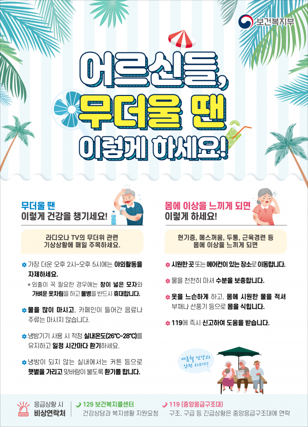 보건복지부는 폭염에 취약한 어르신들이 건강하고 안전하게 여름을 보내실 수 있도록 ‘폭염 대비 취약노인 보호 대책’을 시행 중이며 폭염 대책 기간 동안 현장점검 등을 시행해 폭염에 따른 피해가 발생하지 않도록 철저히 관리 중이다.
