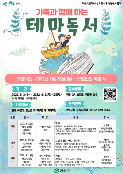 ‘가족과 함께하는 테마독서’는 관악혁신교육지구 관악교육두레 부모독서 동아리 네트워크에서 어린이, 청소년, 학부모, 다문화 가정 등 다양한 계층이 쉽고 즐겁게 책을 접할 수 있도록 기획했다.