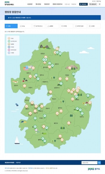 공공캠핑장 정보는 ‘캠핑장 종합안내’ 메뉴를 통해 서비스되며 도내 56곳의 공공캠핑장을 산/숲, 강/계곡/호수의 지형별 특성이나 글램핑, 카라반, 수영장 등 캠핑장에서 제공하고 있는 서비스 유형에 따라 분류해 제공한다.