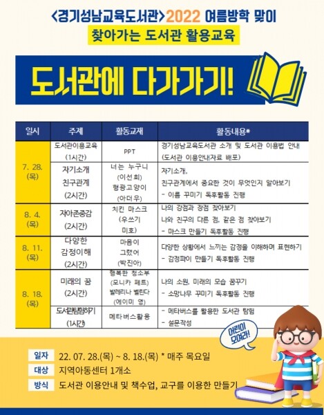 이번 프로그램은 성남시 안에 도서관 접근성이 떨어지는 지역아동센터를 방문해 초등학생에게 독서 흥미 등을 키워주고자 지역아동센터와 연계해 교육도서관이 마련했다.