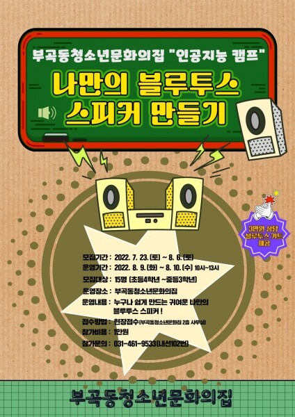 8월 9일부터 10일까지 2일간 운영하는 인공지능 캠프 ‘나만의 블루투스 스피커 만들기’는 부곡동청소년 문화의집 특화사업인 ‘모아메이커 랩’사업의 하나로 청소년들이 과학·발명에 대해 쉽게 이해하고 창의적 사고능력을 증진시켜 창의융합인재로 성장을 돕기 위해 마련됐다.