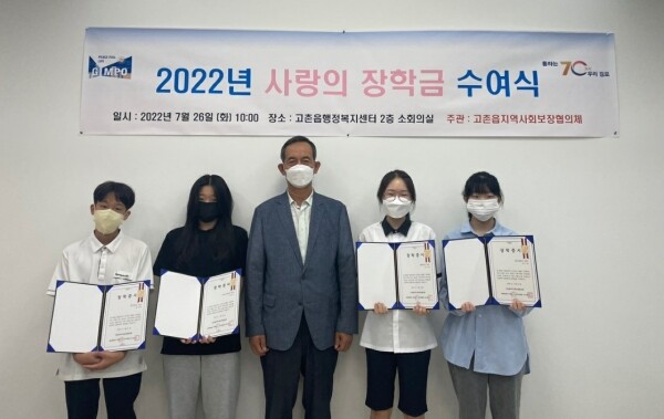 이날 협의체 위원들은 코로나19 방역수칙을 준수하는 가운데 교사 및 학교장 추천을 받은 관내 학업 우수 고등학생 1명 30만원, 중학생 3명 각 20만원 등 총 4명에게 장학증서 및 장학금을 각각 전달했다.